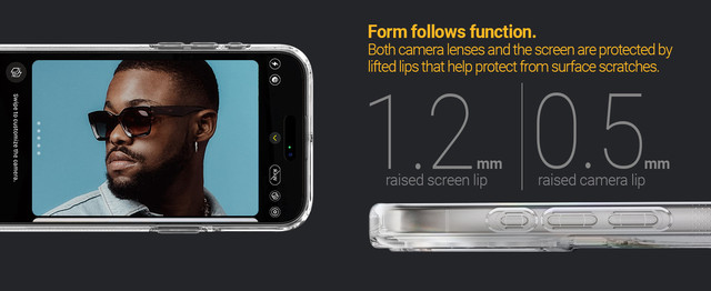 - Підняті краї: Підняті краї навколо камери та екрану на 0,5 мм та 1,2 мм відповідно захищають ці вразливі елементи від царапин та тріщин при контакті з поверхнею.